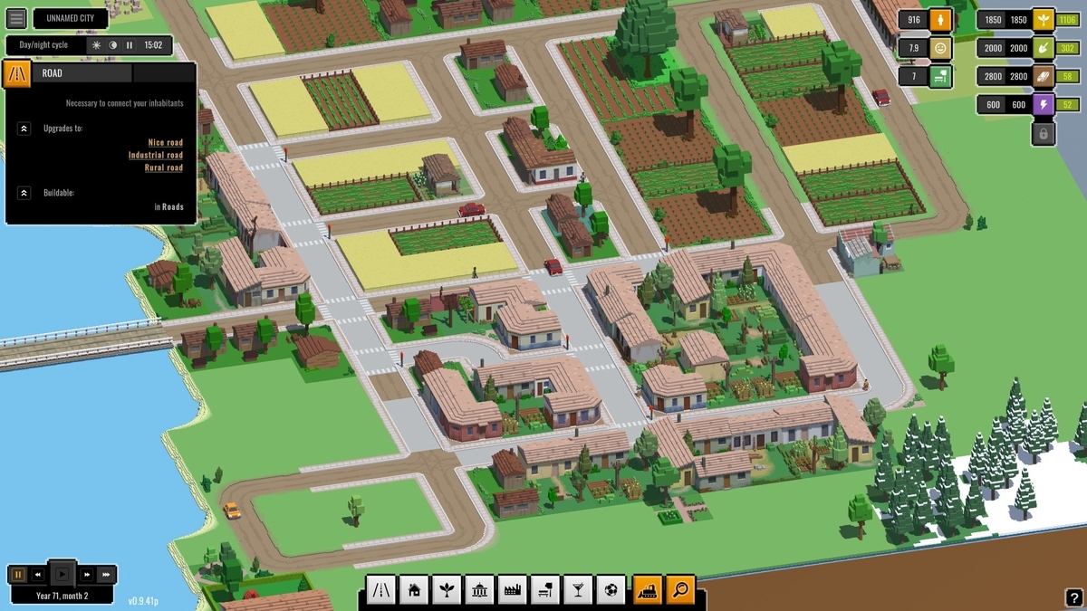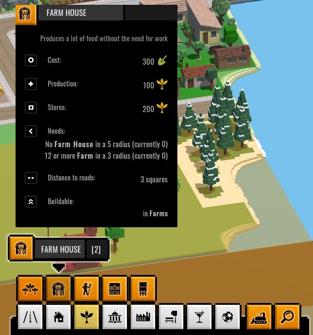 見た目はボクセル調で可愛い感じがします。フィールドは1マスごとに区切られていて、建物や道路、畑などを置く場所を決めてきます。